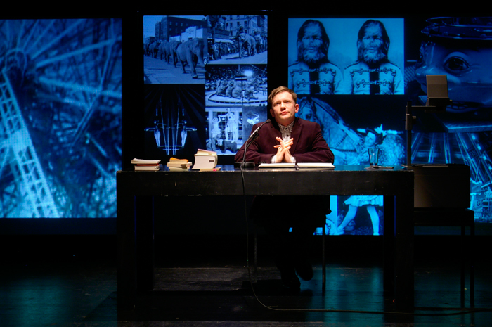 The show is build around the situation of a man holding a scientific lecture before an audience. The stage design and the audience situation are modelled after an academic auditorium. The back of the stage is set by a large projection screen that is divided in sections by wooden frames, like an oversized display cabinet. A large table is positioned in the middle of the stage. The man sits at the table and speaks to the audience. He illustrates his words with video- and overhead-projections on the screen behind him. The show begins as a scientific lecture on the theme of light and shadow, possibly touching on natural science, psychology, cultural history as well as the esoteric. Apparently the man is obsessed with the topic. He is not a scientist by profession but rather by inclination and fascination with his object. Possibly he is a charlatan. As the lecture proceeds the neutral and scientific tone gives way to a more emotional and subjective rhetoric.