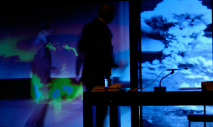 Towards the middle of the show the lecture is interrupted. The actor that plays the man is replaced by another actor, without there being a comment or explanation offered to the audience. A new actor now plays the part and at first it seems as if nothing else had changed. Only towards the end of the show it becomes apparent that two men are present on the scene and that one might be the shadow of the other.